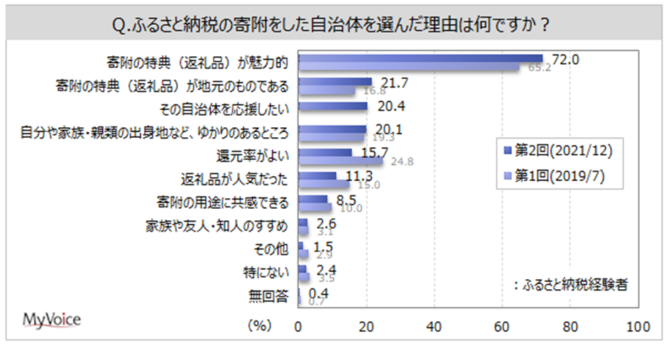 ふるさと納税経験者が、寄附をした自治体の選定理由は(複数回答)、「寄附の特典(返礼品)が魅力的」が72.0%、「寄附の特典(返礼品)が地元のものである」が21.7%、「その自治体を応援したい」「自分や家族・親類の出身地など、ゆかりのあるところ」が各2割です。