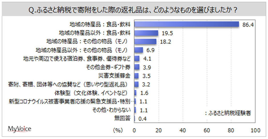 ふるさと納税で寄附をした際の返礼品として選んだものは(複数回答)、「地域の特産品:食品・飲料」がふるさと納税経験者の86.4%、「地域の特産品以外:食品・飲料」「地域の特産品:その他の物品(モノ)」が各2割弱です。「地域の特産品以外:食品・飲料」は男性で比率が高くなっています。