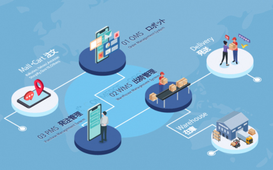 EC業界初のOMS(受注管理)ロボット+WMS(倉庫管理)+PMS(発注管理)のSCM(Supply Chain Management)クラウドでユニットを選択して利用できます。在庫の全体最適化とロボット、自動連携による業務効率化を目指す革新的なシステムです。