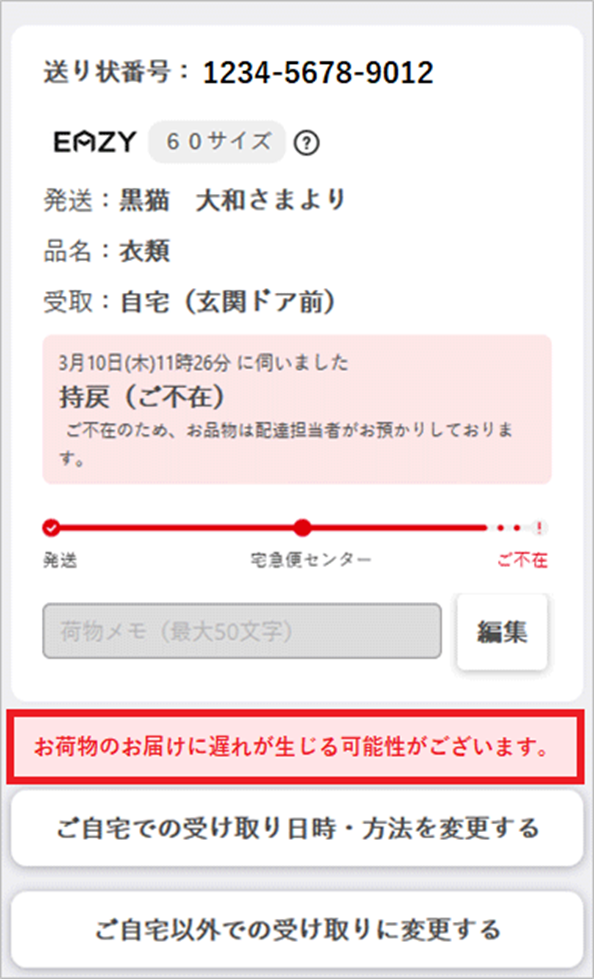 ②災害などによる荷物の遅延情報を、画面上で確認できます荷物の発送や到着エリアに集配規制が発生している場合、注意喚起や遅延情報ページへのリンクを「荷物詳細画面」に表示することで、お客さまがコールセンターやHPで確認する手間を軽減しました。