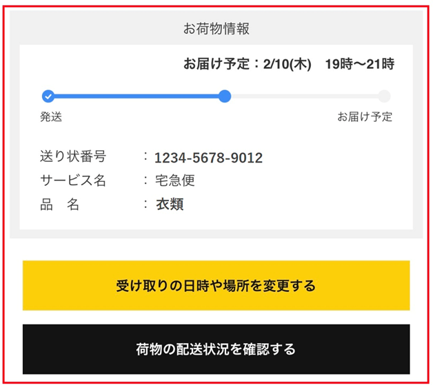 (2)受け取り荷物の情報をお知らせする「各種通知」の機能拡充①各種通知メールに表示される荷物情報や操作項目が見やすくなりました通知メールを文字のみのテキスト形式から画像やボタンに対応するHTML形式に変更し、お届け予定、品名などの荷物情報や、受け取り方法の変更などの操作を視覚的にも使いやすくしました。