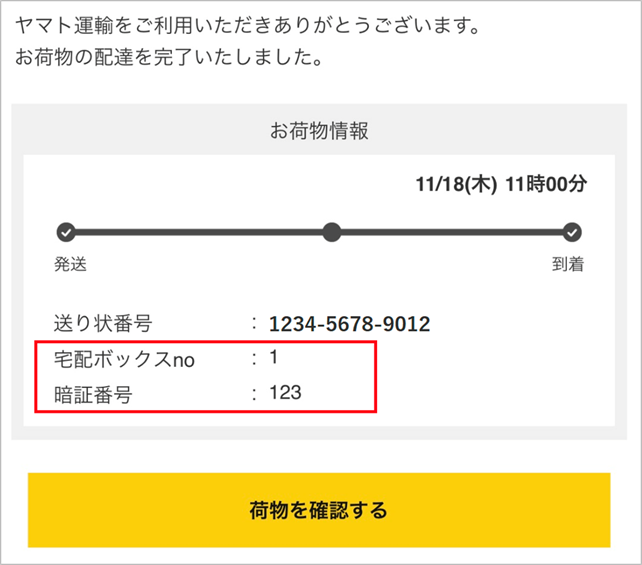 ③ご不在連絡票がなくても、荷物をお届けした宅配ボックスの番号や暗証番号が分かりますお客さまの自宅(戸建・マンション)の宅配ボックスへの配達を、新たに「納品完了通知」の対象に加えました。荷物をお届けした宅配ボックスの番号と暗証番号はご不在連絡票が手元になくても「荷物詳細画面」で確認できます。