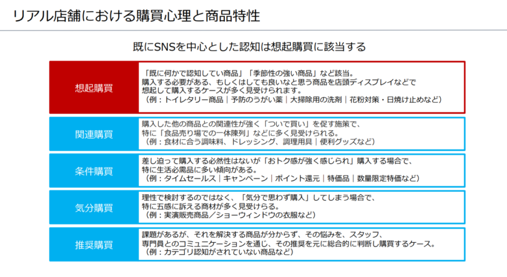 工藤さん:リアル店舗の店頭における購買心理は5つに分類できます(上図)。今回のYOLUのサイネージ広告の効果は、「想起購買」にあたると考えています。想起購買とは、その場で何かを知ったり、思い出したりしたことがきっかけとなり購入につながる消費行動です。