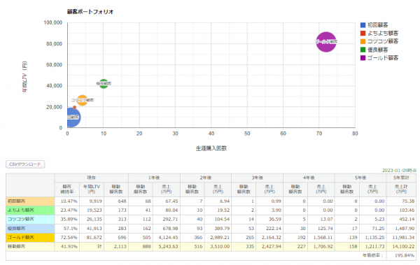 現在の継続率(顧客維持率)を元に、5年先までの顧客数と売上を予測・表示します。顧客BSのポイントは、「新規顧客を獲得せずに既存顧客だけで売上を構築するとどうなるか」を予測する点にあります。 つまり、ショップあるいはブランドを支持しファンになってくれた方の人数(稼働顧客数)と得られる売上(5年間の売上累計額)を、CRMの成果として数字で測ることが可能になりました。