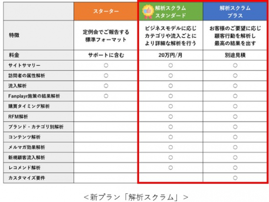 「解析スクラム」は、Fanplayrの導入時、または導入後に、自社のデータ活用状況や施策の頻度、重要度によってスタンダード、プラスの二つのプランからお選びいただけます。
