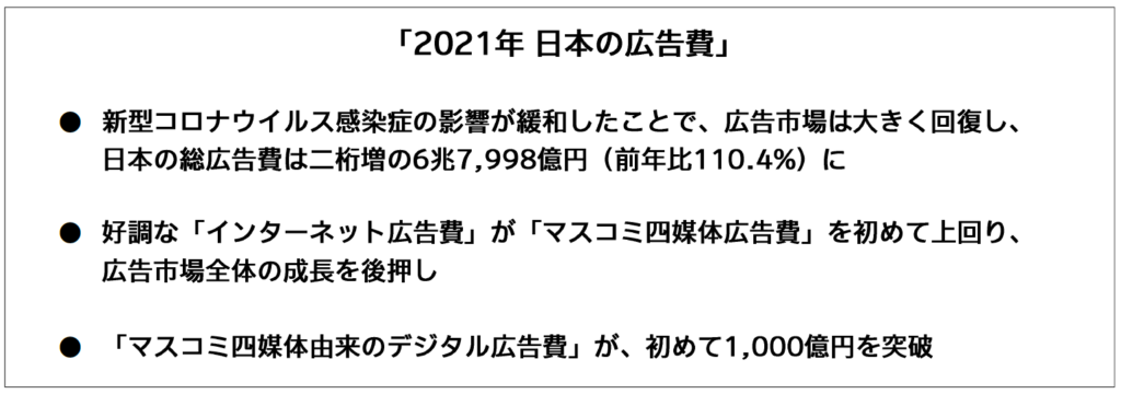北京2022冬季オリンピック・パラリンピックや第26回参議院議員通常選挙、FIFAワールドカップカタール2022などが広告費の押し上げに寄与した。