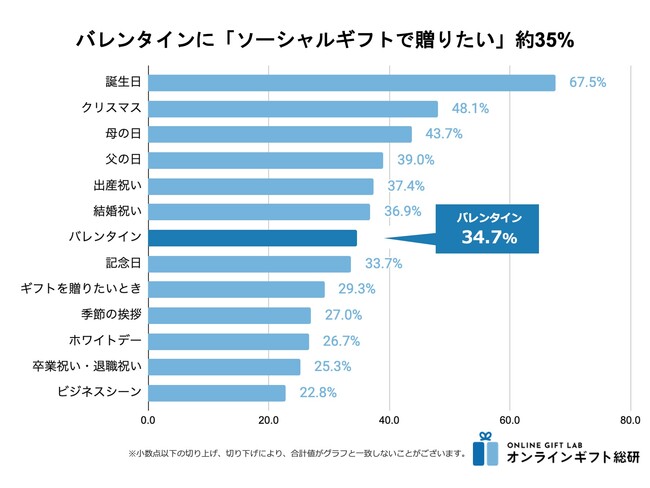また、34.7%の人が「バレンタイン」にソーシャルギフトで贈りたいというアンケート結果も出ています。「誕生日」に関しては、67.5%の人がソーシャルギフトで贈りたいと答えており、ニーズの高さが伺えるでしょう。このような消費者のニーズに応えるために、ソーシャルギフトの対応をされている事業者が増えています。