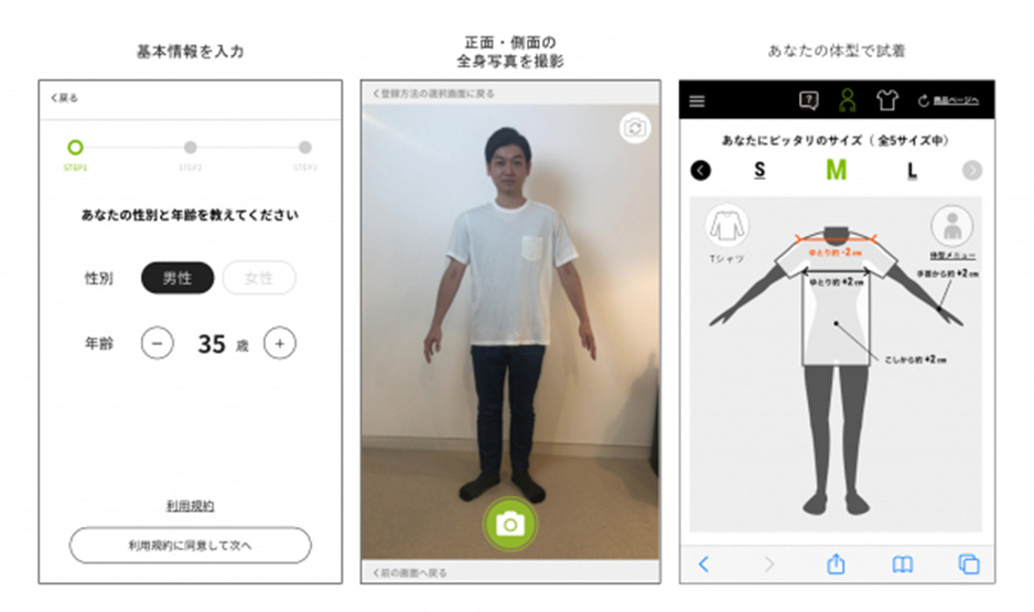 unisize(https://cl.unisize.makip.co.jp/)はネットで洋服を買うときに、より身体に合ったサイズを推奨するレコメンドエンジンです。最短1分の簡単なアンケートに答えるだけで、メジャーで測ることなく自分に合ったおすすめのサイズを確認したり、機械学習アルゴリズム(AI)を用い、お手持ちのスマートフォン端末で撮影した正面と側面の全身写真から、腕の長さや肩幅などの体型を採寸して、サイズを確認することができます。従来のような専門知識やメジャーを用いて採寸するような手間をかけずとも、自分に合うおすすめサイズを確認できます。また、過去に買った洋服と比較する購入履歴比較機能なども併設し、ユーザーの持つ情報に合わせてサイズを確認することができます(※特許取得)。