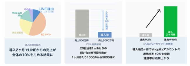 また、導入から2ヶ月ほどでLINE流入からの売上が全体の10%以上を占める結果になり、Shopify連携率も40%と、大幅に伸張しています。