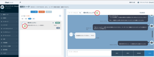 サービス管理画面上の顧客のLINEアイコンに「Shopify連携バッジ」がつき、バッジからShopifyの顧客情報画面に直接アクセスできます。この機能の活用で顧客の状況を理解した上で対応ができるようになり、質問に対応するだけの単調なやりとりでなく、より顧客に寄り添ったコミュニケーションが取れるようになります。