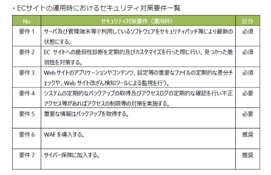 セキュリティガイドラインでは、実務担当者に対して、ECサイト運用時にセキュリティレベルを自己点検して対策を取るための基準として、上記7つの要件を定めています。なお、構築時と同様に、必須/必要/推奨の区分があります。