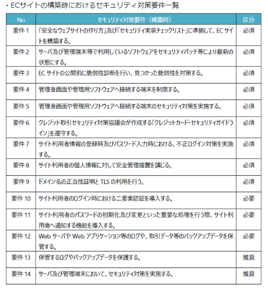 これら14の要件は、さらに必須/必要/推奨に区分されています。基本的に、必須/必要の対策はECサイトに実装しましょう。
