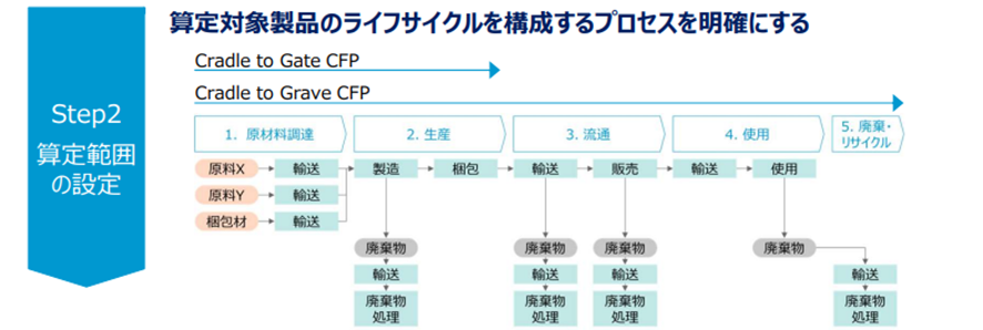 製品のライフサイクルを構成するプロセスの明確化については、カーボンフットプリント ガイドライン P14「CFPの取組の流れの概要」の「Step2 算定範囲の設定」を参照しましょう。
