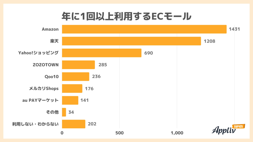 1位 ECモール利用実態調査 人気はAmazon・楽天の2強 利用頻度「月に数回」1ヵ月の利用金額「1万円未満」が最多(Appliv TOPICS調べ)