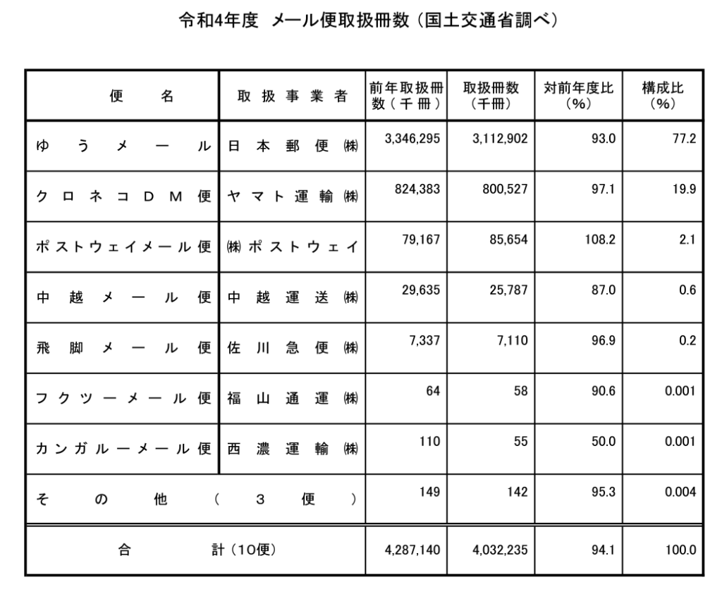 また、メール便のシェアを見ると、「ゆうメール」及び「クロネコDM便」の上位2便で97.1%を占めている。