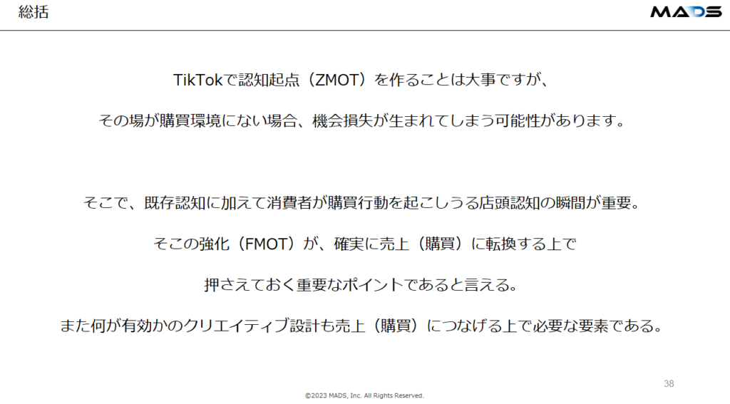 高橋さん:TikTokで認知起点を作ることは大事ですが、その場が購買環境にない場合、機会損失が生まれてしまう可能性があります。そこで、既存認知に加えて消費者が行動を起こしうる店頭認知の強化が、確実に売上(購買)に転換する上で重要なポイントといえるでしょう。