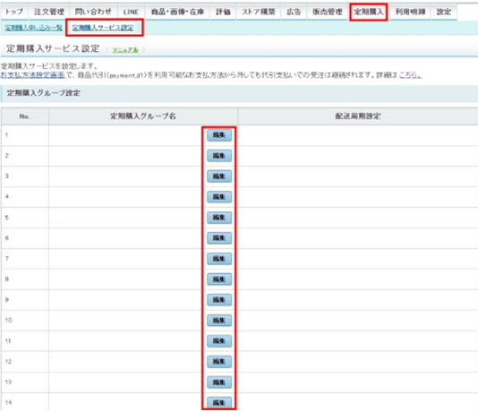 ストアクリエイターPROトップページの「定期購入」タブから「定期購入サービス設定」を選択。「定期購入サービス設定」画面が表示されるので、定期購入グループ設定の「編集」ボタンを押下します。