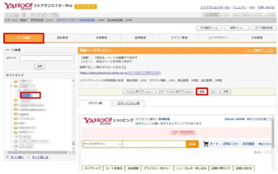 ストアクリエイターPROトップページの「ストア構築」タブの「ページ編集」を選択。表示された画面左カラムの「サイトアップ」から編集したい商品ページを選びます。メインカラムに編集したい商品ページが表示されているのを確認し、「編集」をクリック。表示された「ページ編集」画面上部が「基本情報」のタブであることを確認します。