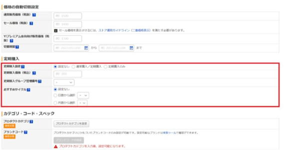 「定期購入のみ」を選択した場合、「セール価格」と「Y!プレミアム会員向け販売価格」は設定不可です。