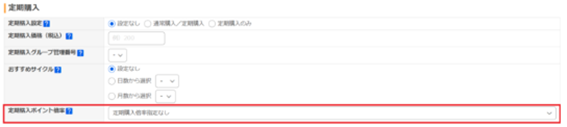 定期購入ポイント倍率定期購入商品ごとにポイント倍率の設定ができます。「通常購入/定期購入」または 「定期購入のみ」を設定した商品のみ適用されます。