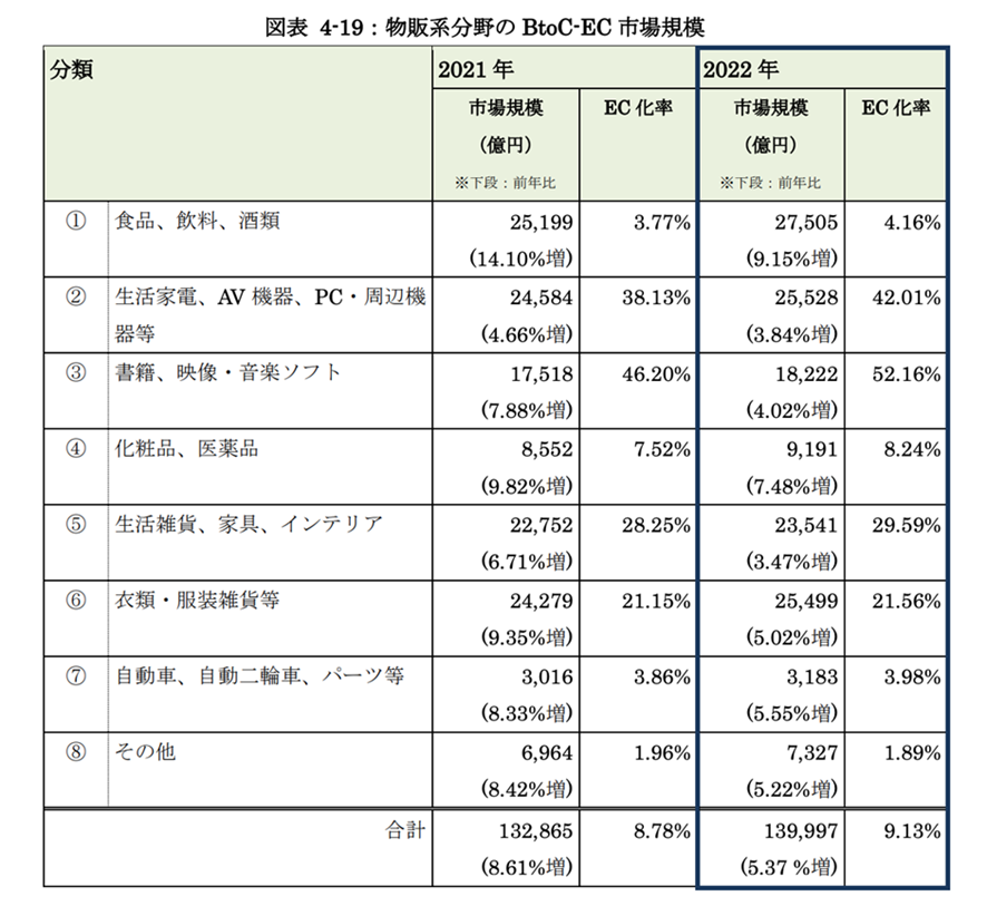 日本の物販系分野のBtoC-EC市場規模は2022-2021年比で5.37%増でした。欧州や米国と比べると著しく低いことがわかります。食品領域などに目を向けると世界水準の成長をしているカテゴリーがあるものの、その他のカテゴリーについては、負けている状況です。