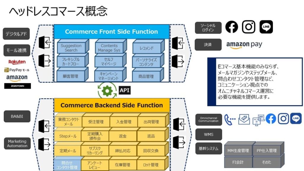 したがって、コマース事業をサポートするためには、ヘッドレスのフロントサイドとバックオフィス機能をバランスよく選定することが重要なのです。また、柔軟性や拡張性、データ連携・解析機能なども重視し、ビジネスの成長に合わせたシステムの機能パーツの入替・選定を行うことが望ましい時代となってきています。