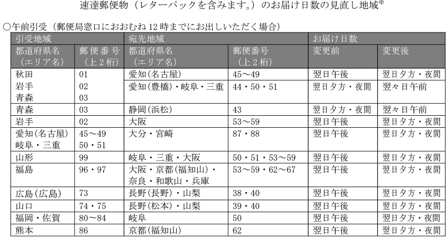 2024年4月1日(月)から、一部地域で引き受けるゆうパックのお届け日数を見直します。 お届け日数見直しの対象地域は別添1のとおりです。
