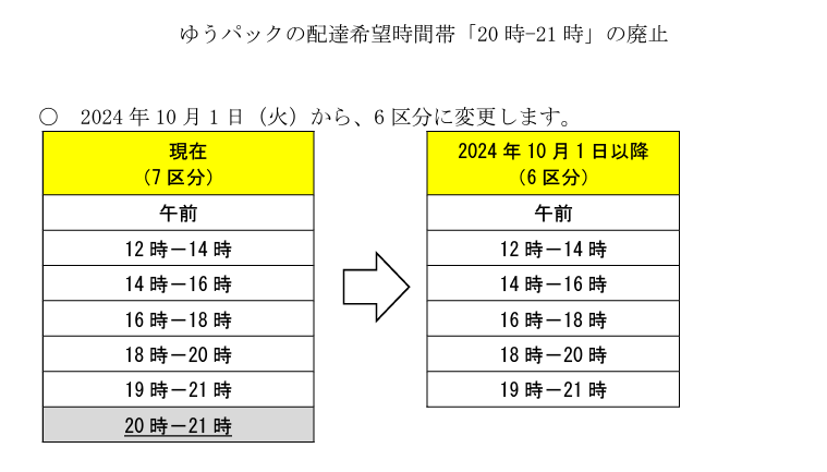 配達を担当する社員などの業務負荷軽減のため、2024年10月1日(火)以降、お引き受けする ゆうパックの配達希望時間帯について「20時-21時」を廃止し、現在の7区分から6区分に変更します。変更内容は別添3のとおりです。