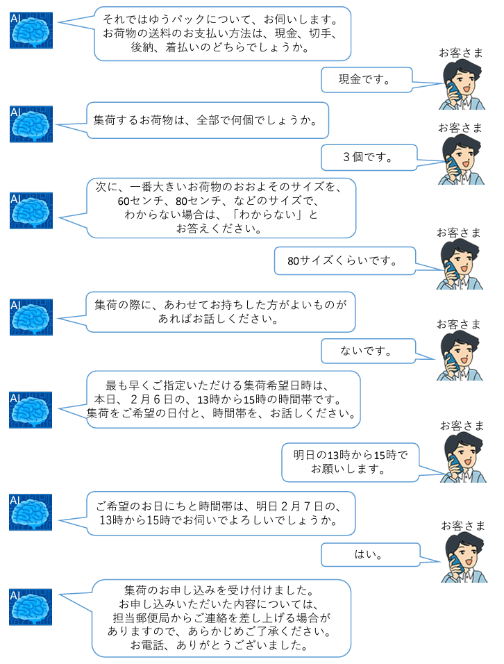 日本郵便株式会社(東京都千代田区、代表取締役社長 千田 哲也/以下「日本郵便」)は、NTT コミュニケーションズ株式会社(東京都千代田区、代表取締役社長 丸岡 亨)が提供するシステムを採用し、お客さまからの集荷依頼のお申し込みに AI が自動的に音声対応する「AI による集荷電話自動受け付けサービス」を 2024 年 2 月 6 日(火)から一部エリアにおいて開始します。