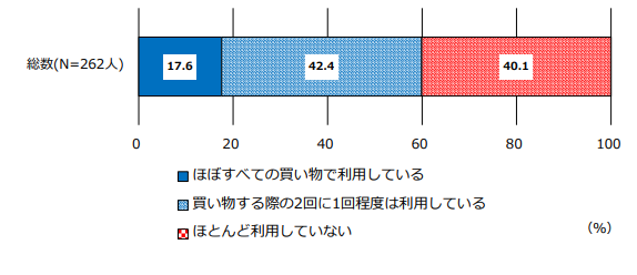 今回のアンケート調査によって、キャッシュレス決済を「ほぼすべての買い物で利用している」人の割合が17.6%、「買い物をする際の2回に1回程度は利用している」人の割合が42.4%となっています。調査の結果、約60%の大学生がキャッシュレス決済を日常的に利用していることがわかります。回答者全体の40.1%が「ほとんど利用していない」を選択していますが、2回に1回程度とまではいかないものの、定期的にキャッシュレス決済を利用している人がいることが次のアンケートの結果から伺えます。