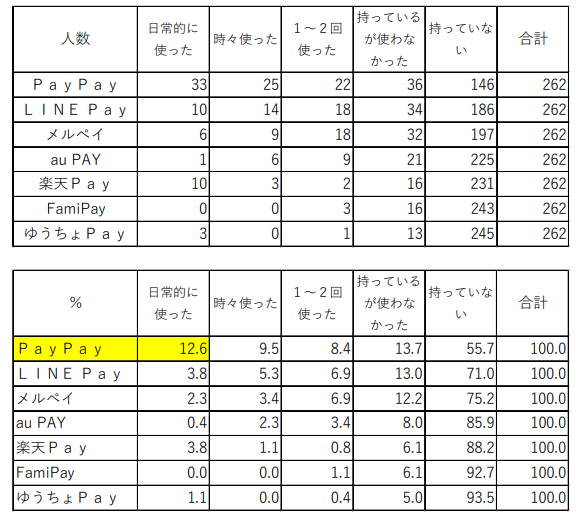 QRコード決済については、アカウントを最も持っている決済手段としてはPayPayの44.3%となっており、それ以外の決済手段は大きく保持率が変わっています。日常的に利用されている割合もPayPayの比率は高く、12.6%となっています。