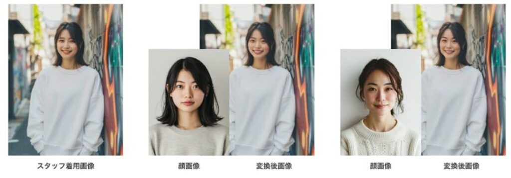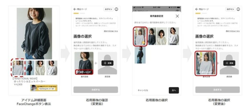 モデルやスタッフコーディネートの顔をユーザー自身の顔に差し替えることで、着用時のイメージを明確化し、オンラインでの商品購入を促進するサービスです。オンラインでユーザーが洋服を購入する際の「自分に似合うかどうかわからない」という不安を解消することができます。