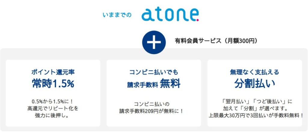 ECも実店舗も使えるatoneの利用シーンの広さに加え、利用者のニーズに応え、さまざまな「あったら嬉しい」を実現する唯一無二のサービスが「atoneプラス」です。月額300円の有料会員サービスで、下記の3つの特徴があります。