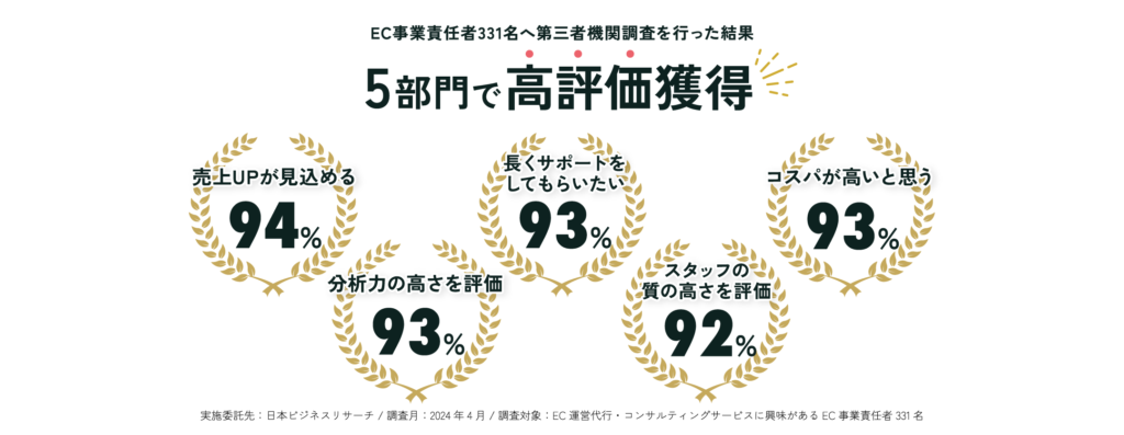 FinnerのEC支援サービスは単月からのスポット契約が可能なことも特徴的で、運用代行では各種広告の運用やSEO業務から商品登録まで幅広くサポートをしているため、EC・ネットショップ運営に必要な業務のほとんどに対応可能です。また第三者機関がおこなった調査により、FinnerのEC支援サービスは「売上UPが見込める 94%」「長くサポートしてもらいたい93%」「コスパ評価 93%」などの高い評価を獲得しています。