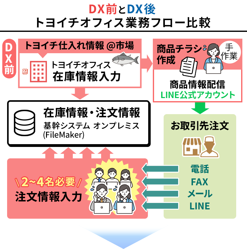 丸山さん:トヨイチさんの課題のひとつが、受注の効率化でした。以前は、毎日(豊洲市場休市日以外の日)15時から0時30分までスタッフの方が常駐して電話やFAXで注文を受け、システムに手動で打ち込んでいました。プロを相手に注文のやり取りをするので、そこを担当するスタッフには水産の知識が必要です。しかし、そのスキルがある人が将来的に不足する可能性があったんです。
