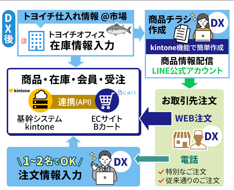 株式会社豊洲漁商産直市場(以下「トヨイチ」)は、全国の漁港から鮮魚を入荷し、飲食店などに卸している会社です。もともと電話・FAXのみでの受注を行っていたところから業務アプリ構築クラウドサービス「kintone」とBtoB EC・Web受発注システム「Bカート」を活用したDXを実施。新たな基幹システムとECサイトにより客単価は1.2倍に、全体の売上規模も1.5倍くらいになったと言います。