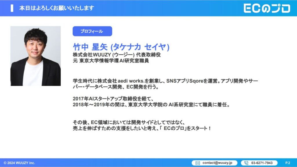 WUUZY社は、即戦力のECマーケターが登録している複業マッチングサービス「ECのプロ」というサービスも提供しています。そこで、うまくいった事例について、代表取締役の竹中さんにお話しいただきました。
