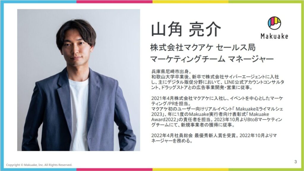 「Makuake」で成功するためには、プロジェクト公開時のスタートダッシュが重要であり、プロジェクト公開直後から3日間で、PVと売上をどれだけ伸ばせるかが、最終着地金額を左右すると山角さんは言います。「Makuake」を活用する際に、キュレーターと呼ばれる担当者からスタートダッシュをはじめ、いろいろとアドバイスを頂けるそうです。