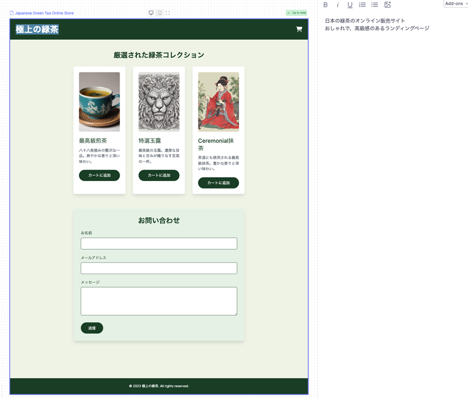 というプロンプトでサイトをデザイン・構築してもらった例です。