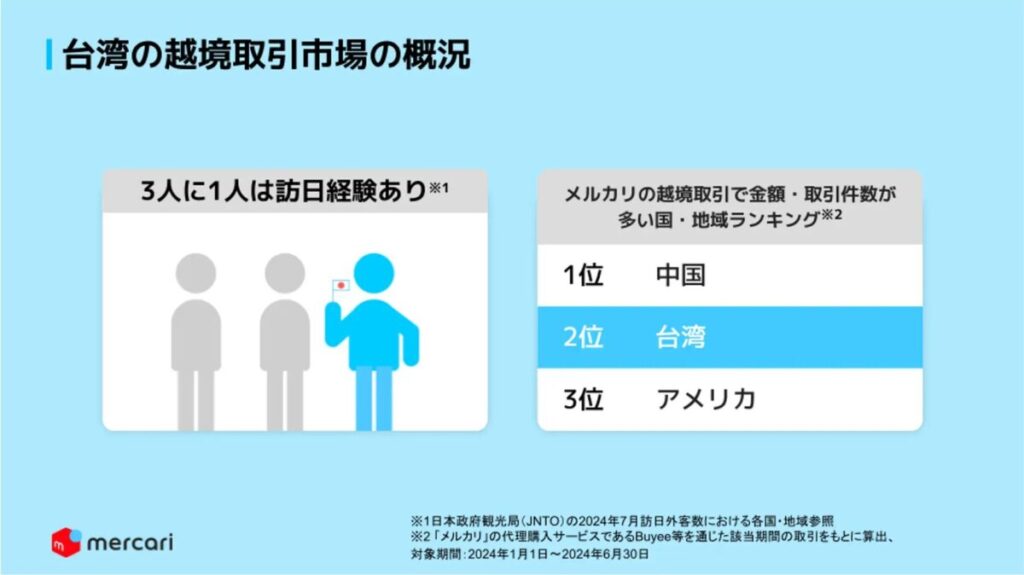 台湾は3人に1人は訪日経験がある(※6)など、日本の商品が受け入れられやすい市場であることから今回の越境取引を通じた進出をいたしました。加えて、メルカリの越境取引で台湾は取引金額・取引件数ともに中国に次ぐ2位(※7)となっており、すでに越境取引が活発な市場です。