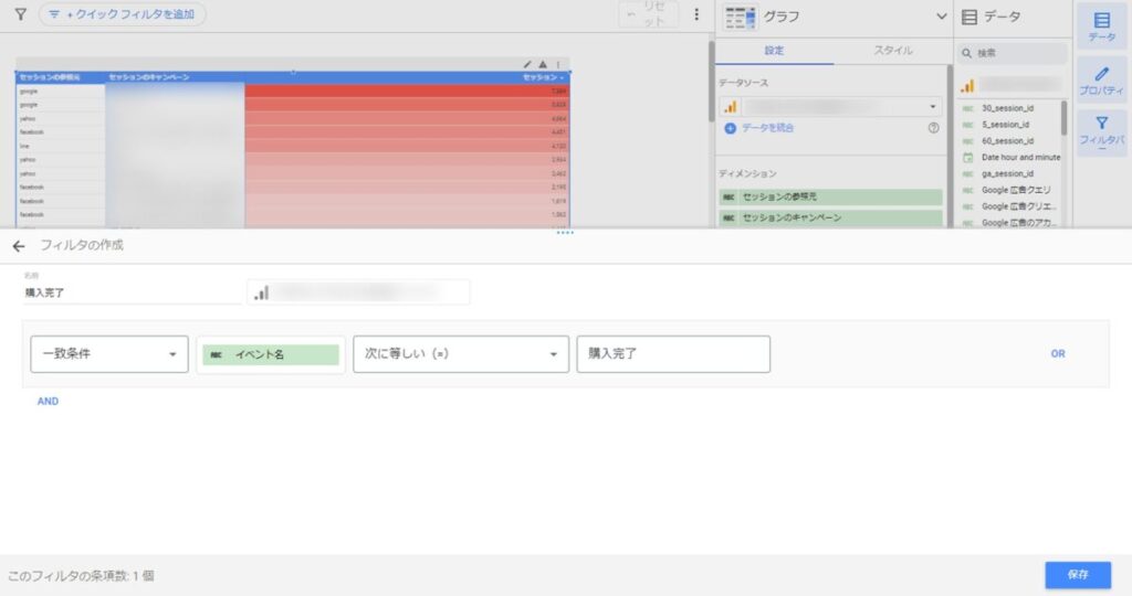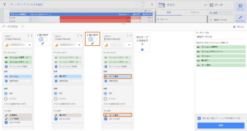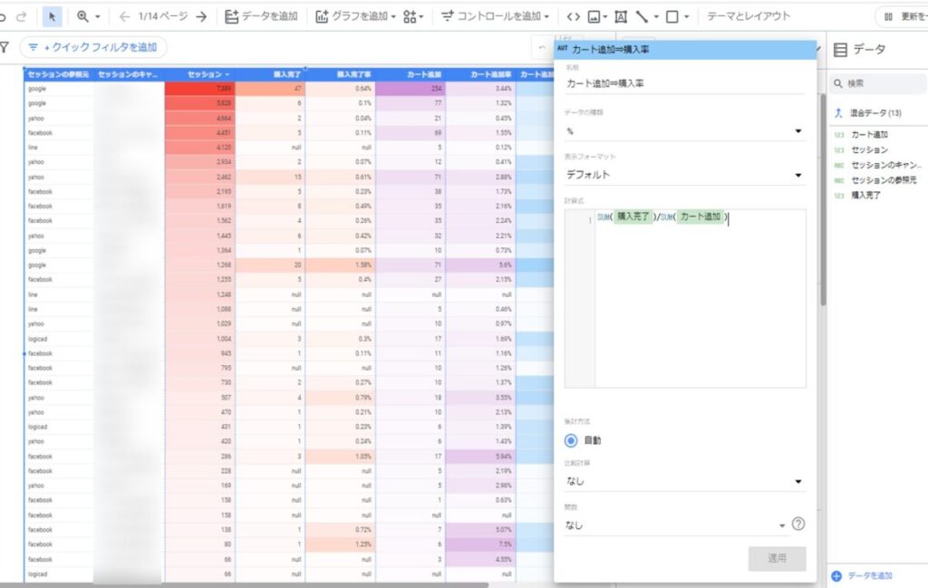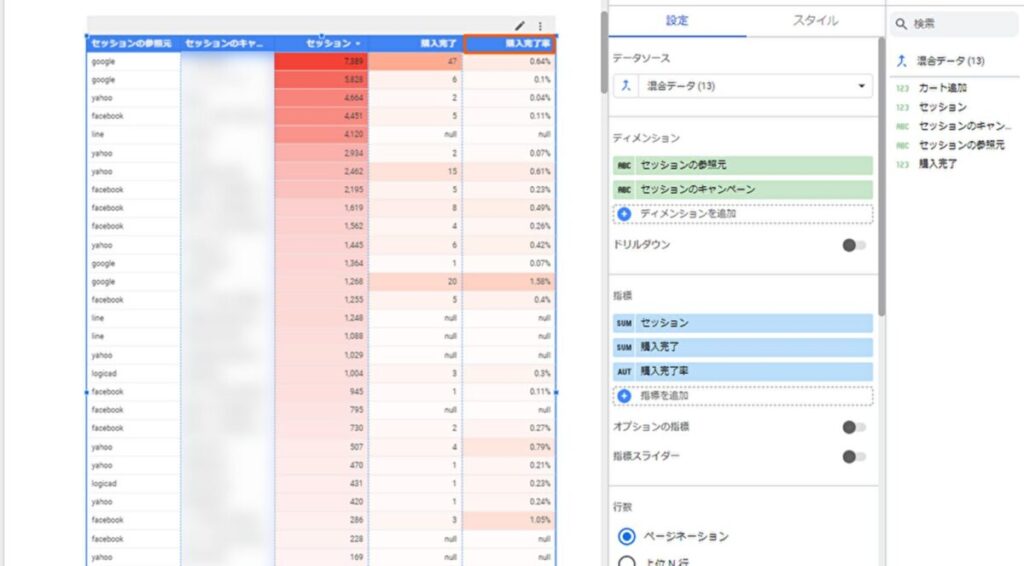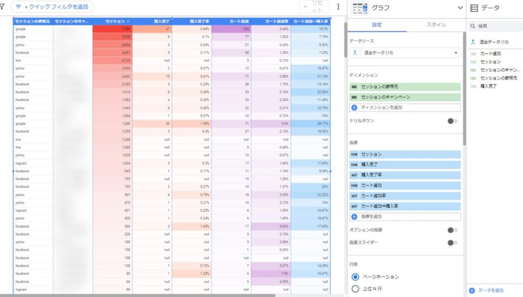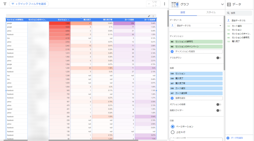 広告のキャンペーンごとに、セッション・「購入完了」イベントの数と率・「カート追加」イベントの数と率・カート追加⇒購入完了の割合 を一つの表で表示させることができました。