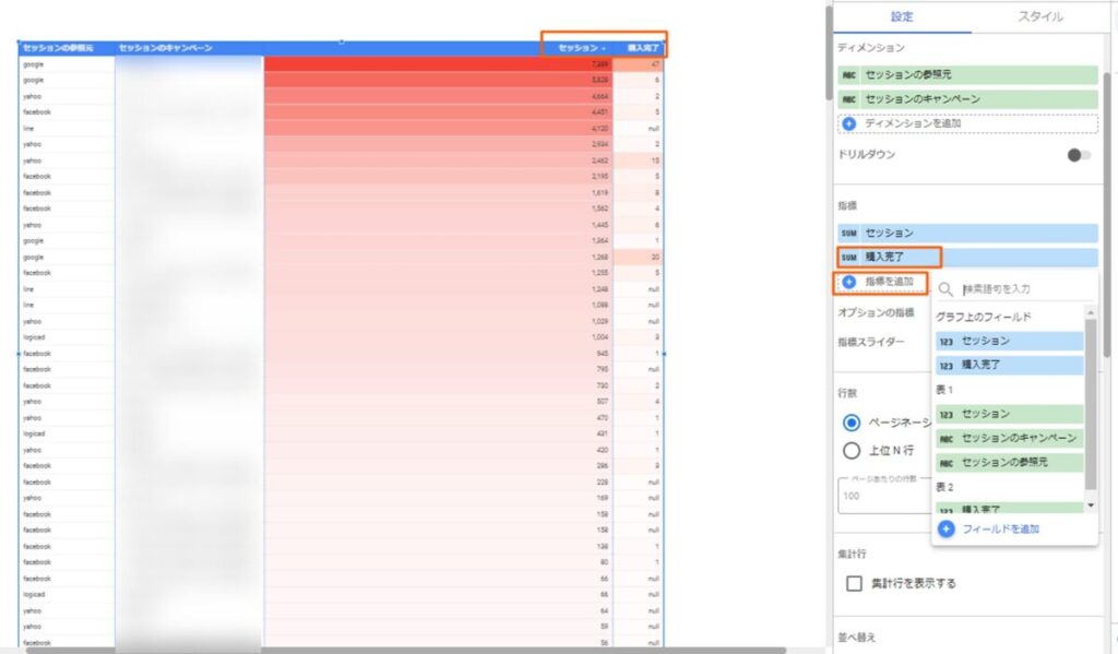 その後、指標の追加をクリックして「フィールドを追加」をクリックすると、指標を自由に計算して表示できるようになります。