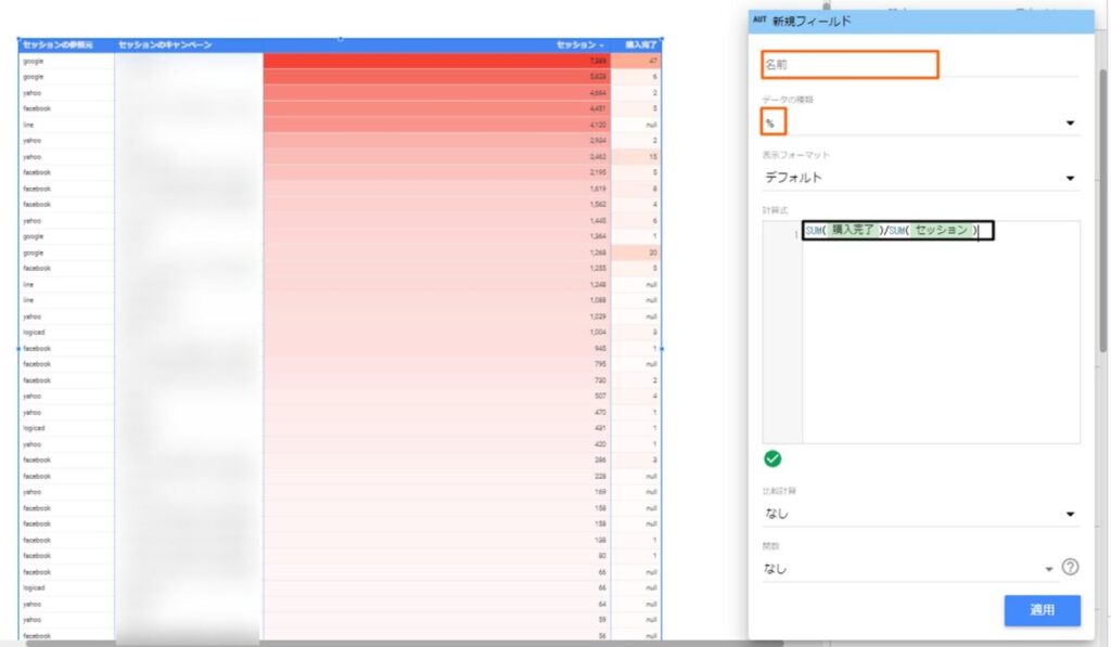 今回の場合、名前に「購入完了率」、データの種類に「%」、計算式に「SUM(購入完了)/SUM(セッション)」といれることで、購入完了率の指標を作成することができます。