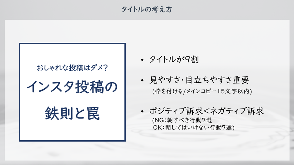 特に複数枚投稿のうち、最初の1枚目の画像が最も重要です。タイトル文は15文字以内に抑え、画像に枠を付ける、数字を用いたコピーなど、複数ある投稿のなかでも目立ち、わかりやすい画像作成を心がけましょう。
