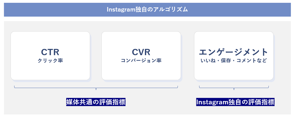 CTRやCVRがまだ集まりきらない配信開始直後でも、いいねや動画視聴率、保存数などの反応がよいクリエイティブを「ユーザーから好かれている」とみなし、Instagramのシステムはより多くの露出を与えようとする傾向があります。つまり、「オーガニック要素の評価が高い広告ほど、メディアからも優遇されやすい」仕組みだといえます。