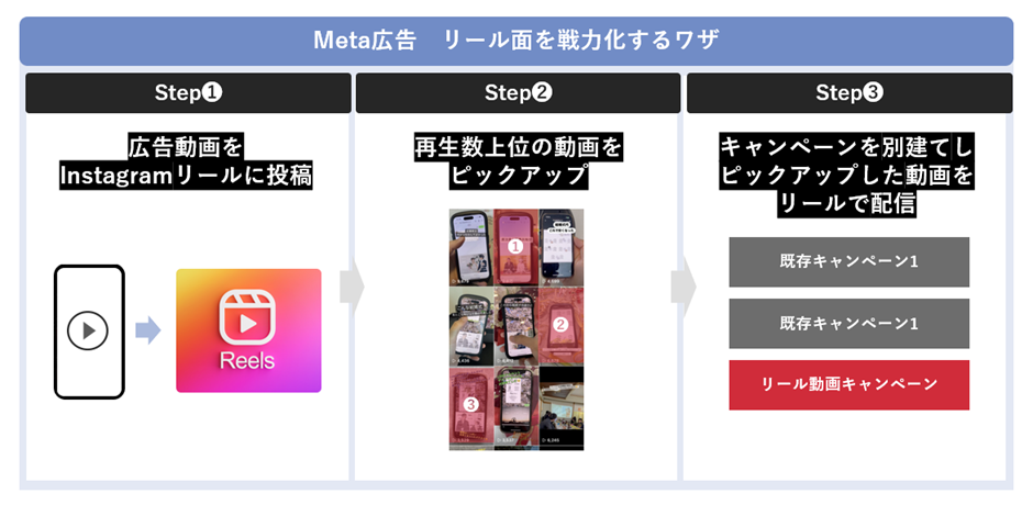 ここでポイントとなるのが、“オーガニック投稿で小さくテストすることで、ユーザーから受け入れられるコンテンツを創出し、大きく育てる”という考え方です。広告クリエイティブのABテストを最初から回すのも大事ですが、Instagramのアルゴリズムを最大限活かすため、オーガニック投稿でユーザーの反応を確認してから広告化するほうが、時間もコストも効率的といえます。