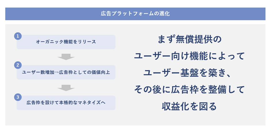 SNSの広告ビジネスは、まずオーガニック(=無償のユーザー向け運用)によってユーザー基盤を築き、その後に広告枠を設置して収益化を図るという流れが典型的です。たとえば今回のThreadsも、