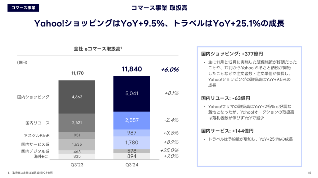 売上収益は前年同期比2.7%減の2,238億円となっています。一方で、Yahoo!ショッピングの取扱高は前年同期比9.5%増となり、特に年末商戦の影響で消費活動が活発化しました。また、ふるさと納税を含む各種キャンペーンが奏功し、取扱高の成長を支えました。さらに、LINEプラットフォーム上でのショッピングタブ導入が進み、シームレスな購買体験の提供が強化されています。