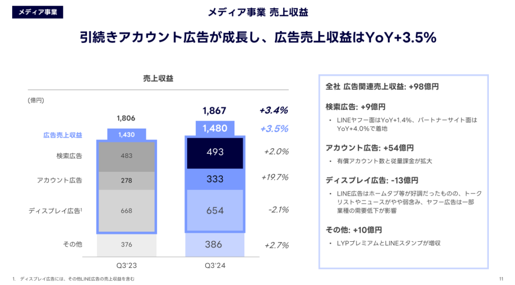 メディア事業の売上収益は前年同期比3.4%増の1,867億円となりました。有償アカウント数の増加と従量課金の拡大により、アカウント広告が前年同期比19.7%増となっています。検索広告も前年同期比2.0%増加しました。一方で、ディスプレイ広告は特定の業種における広告出稿の減少の影響を受け、前年同期比2.1%減少しています。
