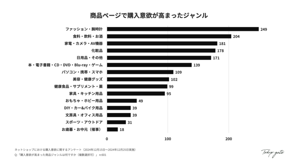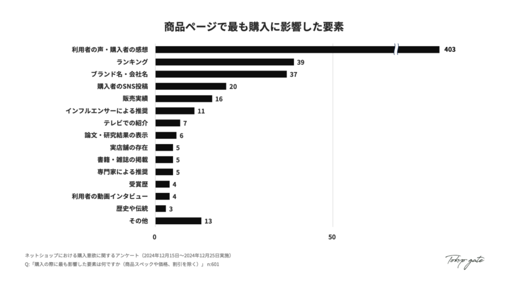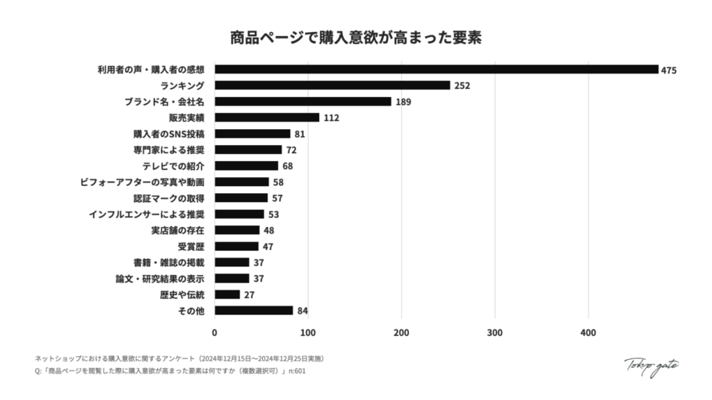 株式会社TOKYO GATEでは、2024年12月15日から2024年12月25日にかけて、オンラインショップで購入経験のある18-70歳の男女601人を対象に、オンラインショップにおける購入意欲に関するアンケートを実施しました。